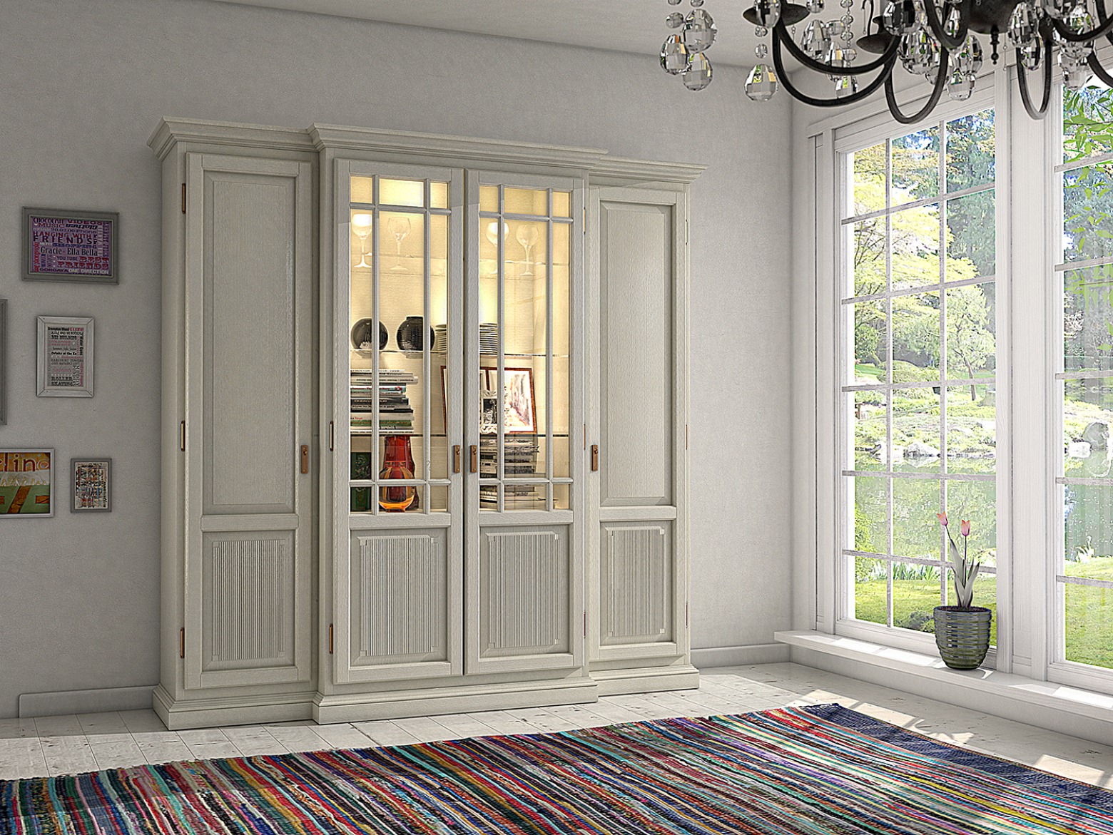 mittig oben: 2-türiges Mittelteil vorgezogen, oben Glasfüllung mit Holzsprossen, dahinter 3 Glaseinlegeböden 8 mm stark